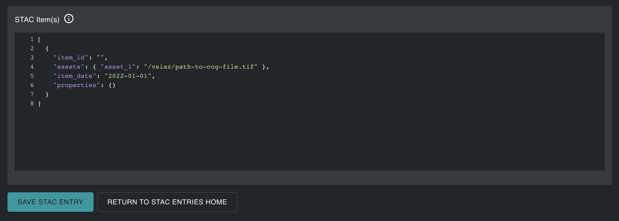 The second GUI in the STAC Entires tool contains a template JSON to create Items and Assets to add to the chosen STAC Collection.